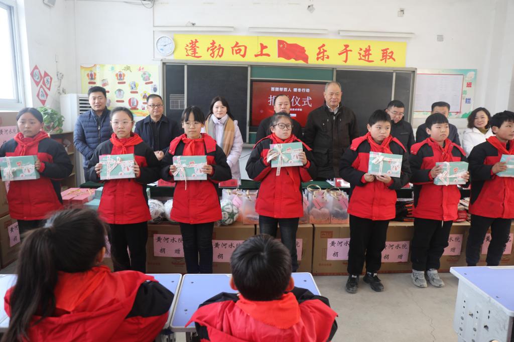 座谈会后,在范县龙王庄镇于楼小学举行了校地结对帮扶捐赠仪式。杨士恒代表学校向于楼小学捐赠价值2万元的防寒物资与文体用品。他强调,学校党委高度重视“校地结对帮扶”工作,近年来多次赴范县开展科技帮扶、智力帮扶、人才帮扶等工作。他勉励同学们要认真学习、积极锻炼身体,未来有机会来黄河水院读书深造。