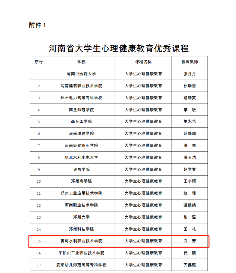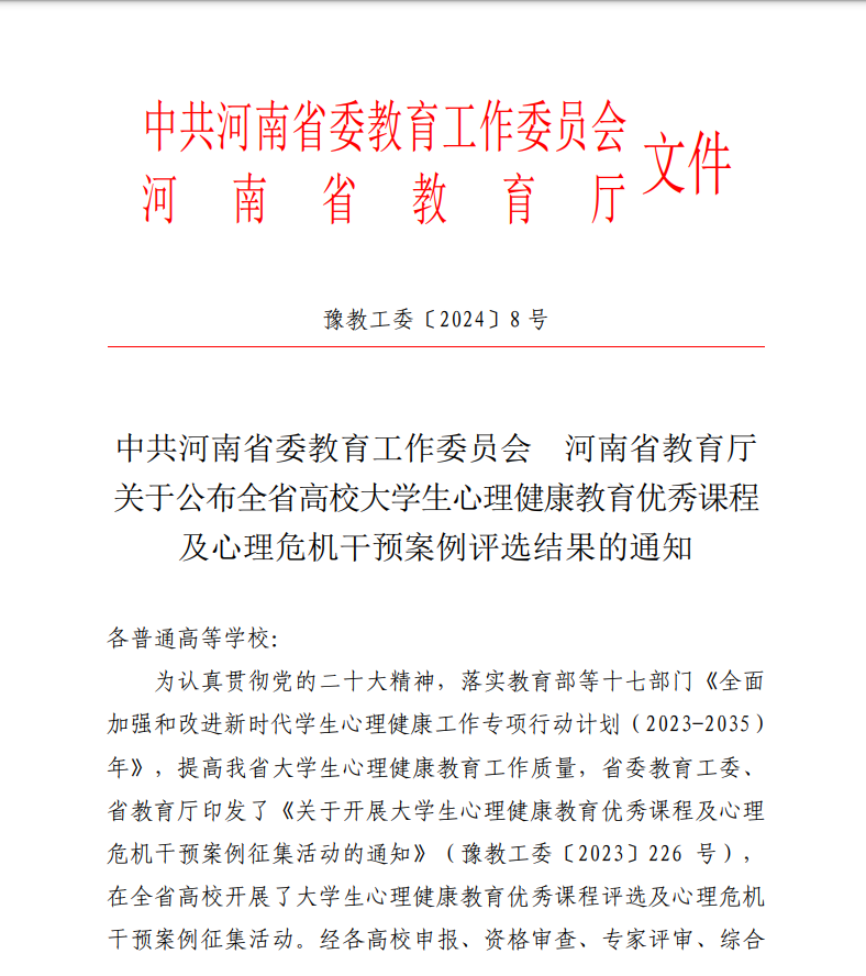 近日,中共河南省委教育工作委员会、河南省教育厅印发《关于公布全省高校心理健康教育优秀课程评选结果的通知》(豫教工委〔2023〕226号),全省共评选出30门优秀《大学生心理健康教育》课程,我校方芳老师负责的《大学生心理健康教育》课程位列其中。