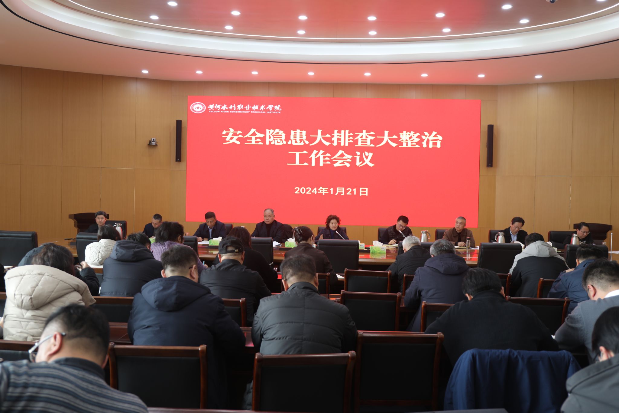 1月21日,我校在行政楼学术报告厅召开安全隐患大排查大整治工作会。全体校领导出席会议,各部门各单位党政负责人参会。就学校安全管理相关工作,校党委书记周保平提出明确要求,校党委副书记、校长胡昊作出具体部署。