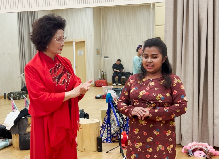 豫剧表演艺术家虎美玲老师在录制前指导刘黄河豫剧唱腔