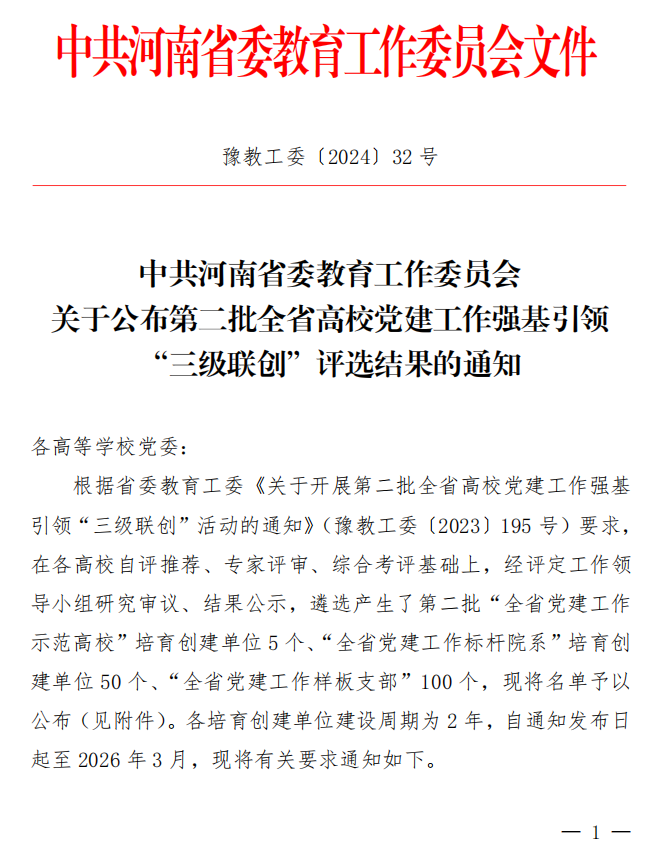 近日,中共河南省委教育工委发布了《关于公布第二批全省高校党建工作强基引领“三级联创”评选结果的通知》(豫教工委〔2024〕32号)。我校的党建“双创”工作取得新突破,入选全省党建工作“标杆院系”培育创建单位和全省党建工作“样板支部”培育创建单位各1个。