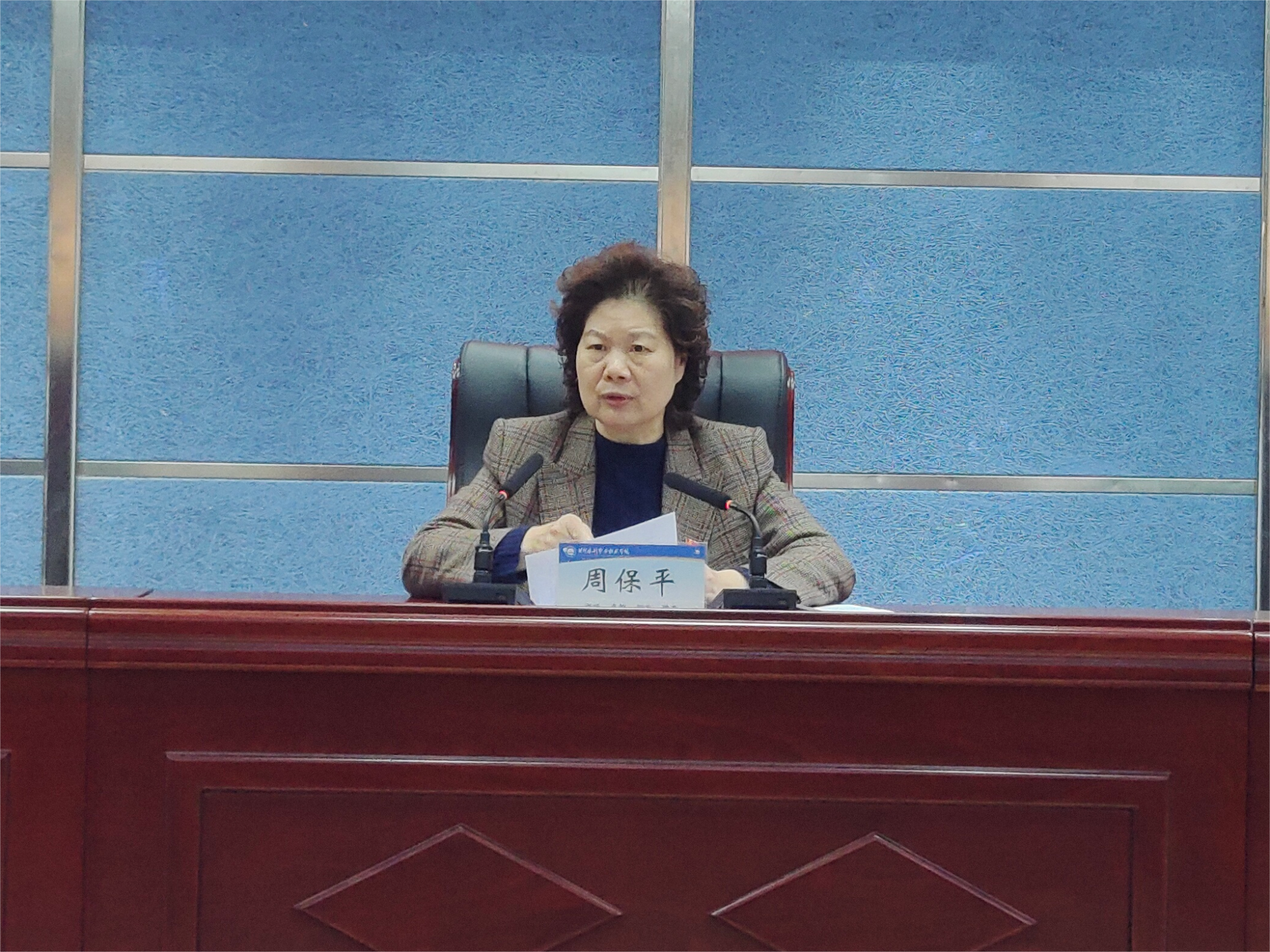 周保平指出,全校上下正在深入学习宣传贯彻全国两会精神,尤其是深入学习宣传贯彻习近平总书记在参加江苏代表团审议时对职业教育作出的重要指示精神。本次培训班的举办恰逢其时,是学校深入贯彻落实新时代党的组织路线、加强干部队伍建设的重要举措,对新提任中层干部提升履职能力、增强工作本领具有重要的意义。她从学校事业发展的高度对新提任中层干部提出了五点要求:一是要旗帜鲜明讲政治,做到对党绝对忠诚、坚定理想信念、强化思想自觉、增强政治定力,以全面落实立德树人为根本任务,履职尽责,注重工作实效,为职业教育更高质量发展贡献力量。二是要勤练内功强本领,以习近平总书记对干部特别是年轻干部提出的“提高七种能力”为标杆,面对事业发展过程中遇到的困难,拿出“想干事”的态度,“能干事”的本领,全力以赴争取“干成事”的结果,迎头而上,敢于突破。三是要实干担当善作为,以“干”字为要、“快”字为先、“实”字为本,紧紧围绕学校全面完成“双高计划”建设任务、创建本科层次职业院校、争创全国文明校园等中心工作,真抓实干,狠抓落实。四是要遵规守纪筑防线,时刻牢记党章党规党纪,牢记清廉是福、贪欲是祸,转变自身观念,从不敢腐、不能腐到不想腐,守住政治关、权力关、交往关、生活关、亲情关,以身作则,怀德自重。五是要持之以恒抓学习,自觉加强理论学习、厚实理论功底,不断完善履职尽责必备的知识体系,坚持干什么学什么、缺什么补什么,并把学习成效转化为做好本职工作、推动事业发展的生动实践,努力使自己真正成为行家里手、内行领导,通过学习调研推动学校各项事业向更深处进、更实处行。