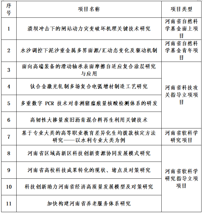 近日,河南省科学技术厅印发了《关于下达2024科技发展计划的通知》,我校共有11个项目获批立项,其中河南省自然科学基金面上项目1项、青年项目1项,河南省科技攻关指导立项项目4项,河南省软科学研究项目1项,河南省软科学研究指导立项项目4项。