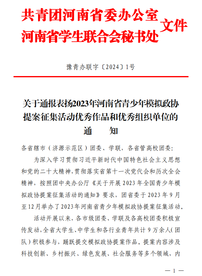 近日,共青团河南省委和河南省学生联合会秘书处联合公布了2023年河南省青少年政协模拟提案征集活动评审结果,我校推报的《关于“光盘行动”实施建议》提案荣获“2023年河南省青少年模拟政协提案征集活动优秀作品(大学组)”。