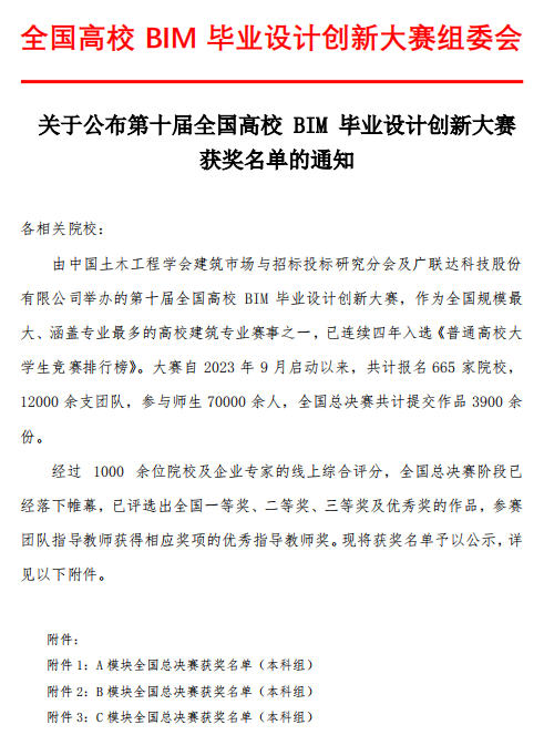 全国高校BIM毕业设计创新大赛由中国土木工程学会及广联达科技股份有限公司主办,东南大学、华南理工大学、青岛理工大学、重庆建筑工程职业学院承办,本专科共同参与。大赛自2023年9月启动以来,共计报名665家院校,12000余支团队,参与师生70000余人,全国总决赛共计提交作品3900余份。大赛以BIM技术为主线,将工程建设的多阶段、多专业进行有机融合,覆盖本科、专科建筑全专业,为师生提供了一个多学科、多专业交叉融合、创新应用的良好舞台。同时,BIM毕业设计大赛打破传统毕业设计模式,为师生提供了新形式、数字化的毕业设计课题,在专业教学中探索新的模式,为专业注入新鲜血液。