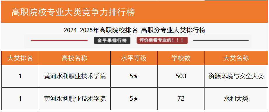 “国家级高水平专业群综合竞争力评价”数据显示,我校水利水电建筑工程专业群、测绘地理信息专业群2个高水平专业群上榜入围,在同类专业群中位列全国第一;高职院校分专业大类竞争力排行榜”数据显示,我校资源环境与安全大类、水利大类2个分专业大类均位列全国第一;“高职院校分专业类竞争力排行榜”数据显示,我校测绘地理信息类、水文水资源类、水利工程与管理类、水土保持与水环境类4个专业类均位列全国第一;“高职院校专业竞争力排行榜”数据显示,我校14个专业上榜,其中测绘地理信息技术、摄影测量与遥感技术、地籍测绘与土地管理、无人机测绘技术、水文与水资源技术、水利工程、智慧水利技术、水利水电工程技术、水利水电建筑工程、水土保持技术、水电站设备安装与管理、治河与航道工程技术12个专业位列全国第一,测绘工程技术、水生态修复技术2个专业位列全国第二,土木工程检测技术、环境检测技术2个专业位列全国第三。
