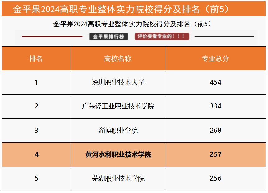 5月16日,“金平果”第四次发布高职专业群综合竞争力评价数据,第五次发布高职专业排行榜。我校在“金平果”排行榜中2个专业群、2个专业大类、4个专业类、12个专业均列全国第一“高职专业整体实力院校”方面,我校位列全国第四。