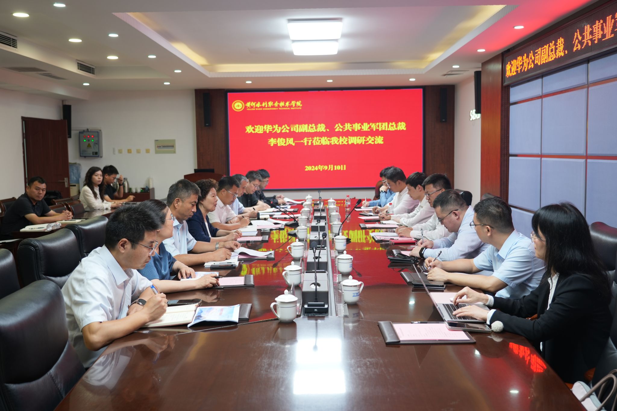 胡昊就我校ICT人才培养、HCIE证书认证、数字信息化建设、智慧水利等情况进行了详细介绍,并对华为长期以来对学校建设发展的关心和支持表示感谢。他表示,此次李俊风副总裁亲自带队前来,充分体现了华为对我校人才共育的高度重视。他指出,一要搭好合作共赢平台。希望双方在前期合作的基础上,建立更加紧密的合作伙伴关系,共享双方优势资源,拓宽专业合作领域,“以点带面”在全校范围内形成辐射作用,实现互利共赢和长期合作。二要建好长效沟通机制。强化顶层设计,健全完善定期沟通协调、处室间对口联络、任务跟踪落实等常态化工作机制,定期协调对接,加强交流互访,实现信息共联、思路共商、资源共享,致力于将学校打造成为中西部地区具有示范引领效应的标杆院校。三要做好几项重点工作。重点在人才培养、社会服务、智慧校园建设等方面下功夫,双方将在HCIE证书认证、人工智能教材编写、“岗课赛证”、实训基地建设等领域深度合作。同时,加强科研合作,依托智算中心平台建设,深入开展大模型研究,开展人智协同教学生态建设,推动信息化样板校、国家智能社会治理实验基地建设落实落地。