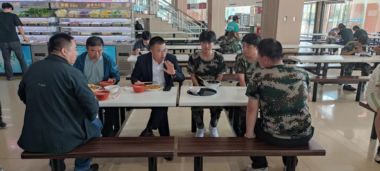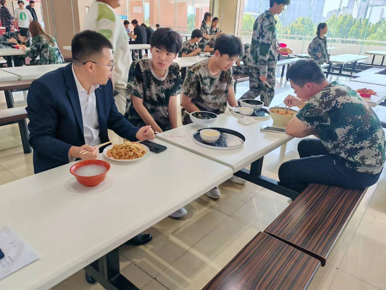 在学生餐厅,胡昊与学生一起排队就餐,在就餐过程中,与学生进行亲切交谈,仔细询问学生对食堂环境、饭菜价格、饭菜种类等方面的意见感受,了解同学们对餐饮服务的建议需求,同时了解同学们的思想动态、学习和生活状态。