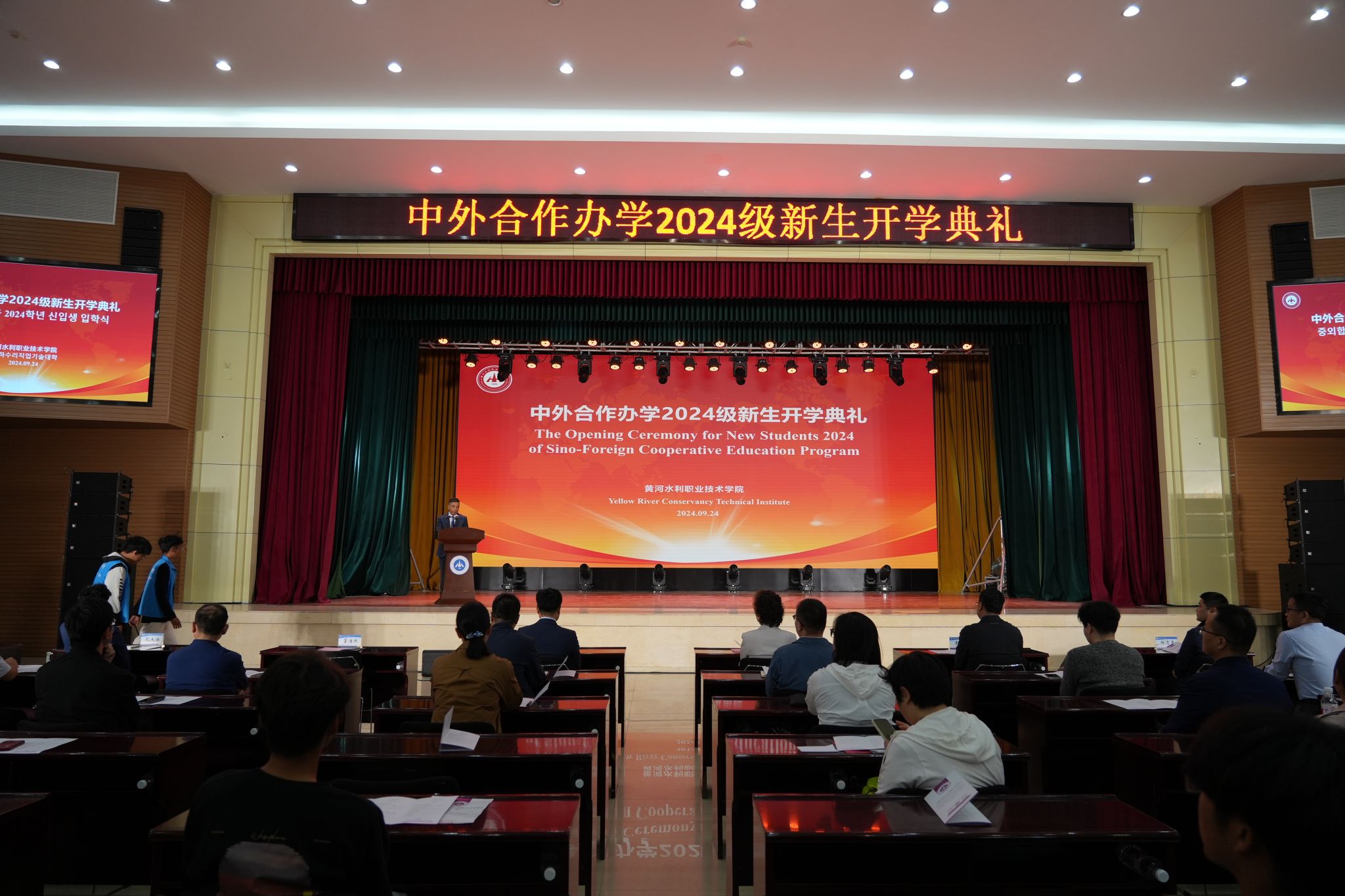 9月24日午,我校中外合作办学2024级新生开学典礼在学生活动中心隆重举行。校党委书记周保平副校长菅浩然,教务处、团委、对外联络与合作处等部门负责人,国际教育学院和中外合作办学各学院负责人,教师代表2024级全体新生参加典礼。韩国大邱大学校长朴辰、国际处处长李升熙国际合作办公室主任孔大锡以及河南省外事侨务服务中心部长杨志勇应邀出席典礼。典礼由菅浩然主持。