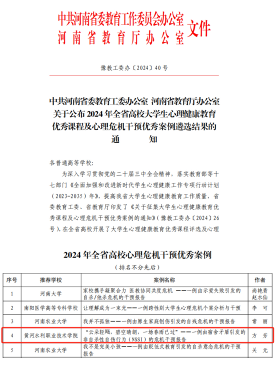近日,全省高校心理危机干预优秀案例评选揭晓,根据河南省委教育工委、河南省教育厅《关于公布全省高校大学生心理健康教育优秀课程及心理危机干预案例评选结果的通知》,共评选出心理危机干预工作优秀案例50个我校心理健康教育中心教师方芳申报的心理危机干预案例入选“2024年全省高校心理危机干预优秀案例”。