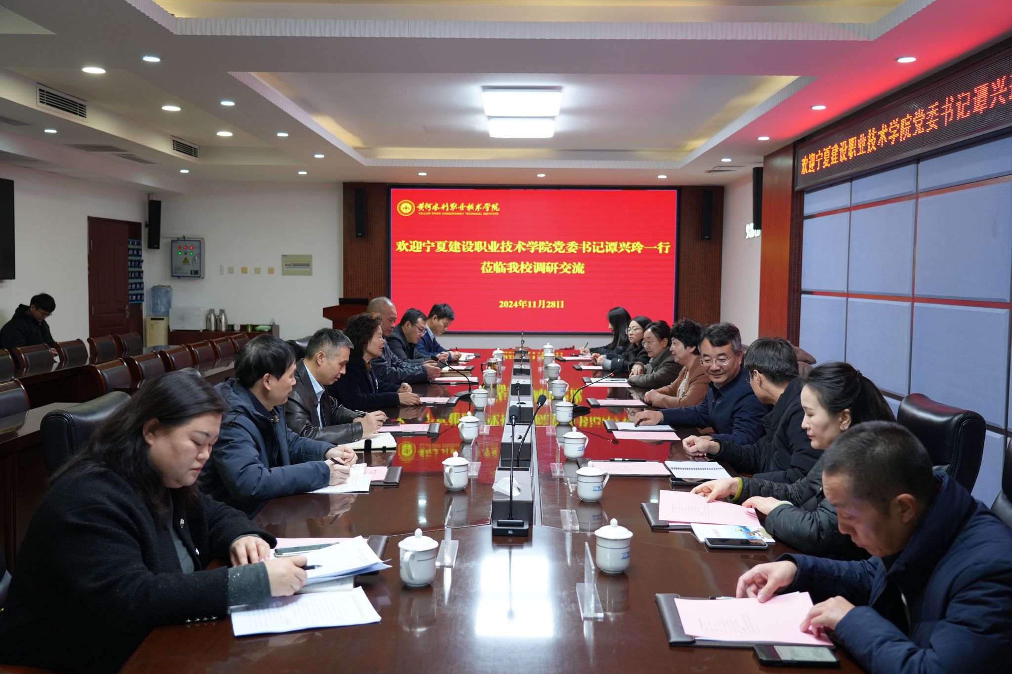 11月28日,宁夏建设职业技术学院党委书记谭兴玲、党委副书记李润安一行8人到我校考察交流。校党委书记周保平,党委副书记、工会主席杨士恒,副校长朱焕立等出席交流活动,党政办公室、保卫部、教育教学督导室、水利工程学院、信息工程学院、马克思主义学院等部门负责人参加了交流。