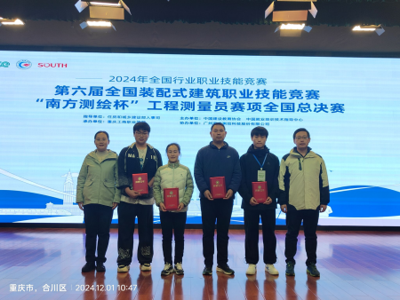 11月28日至12月1日, 2024 年全国行业职业技能竞赛——第六届全国装配式建筑职业技能竞赛“南方测绘杯”工程测量员赛项全国总决赛在重庆工商职业学院举行,来自全国的46支队伍同台竞技,我校选派测绘工程学院孙清娟、张贵豪两位老师及陈森、何晓冬两位学生分别参加职工组和学生组比赛。经过激烈角逐,教师分获二、三等奖,学生分获一、二等奖