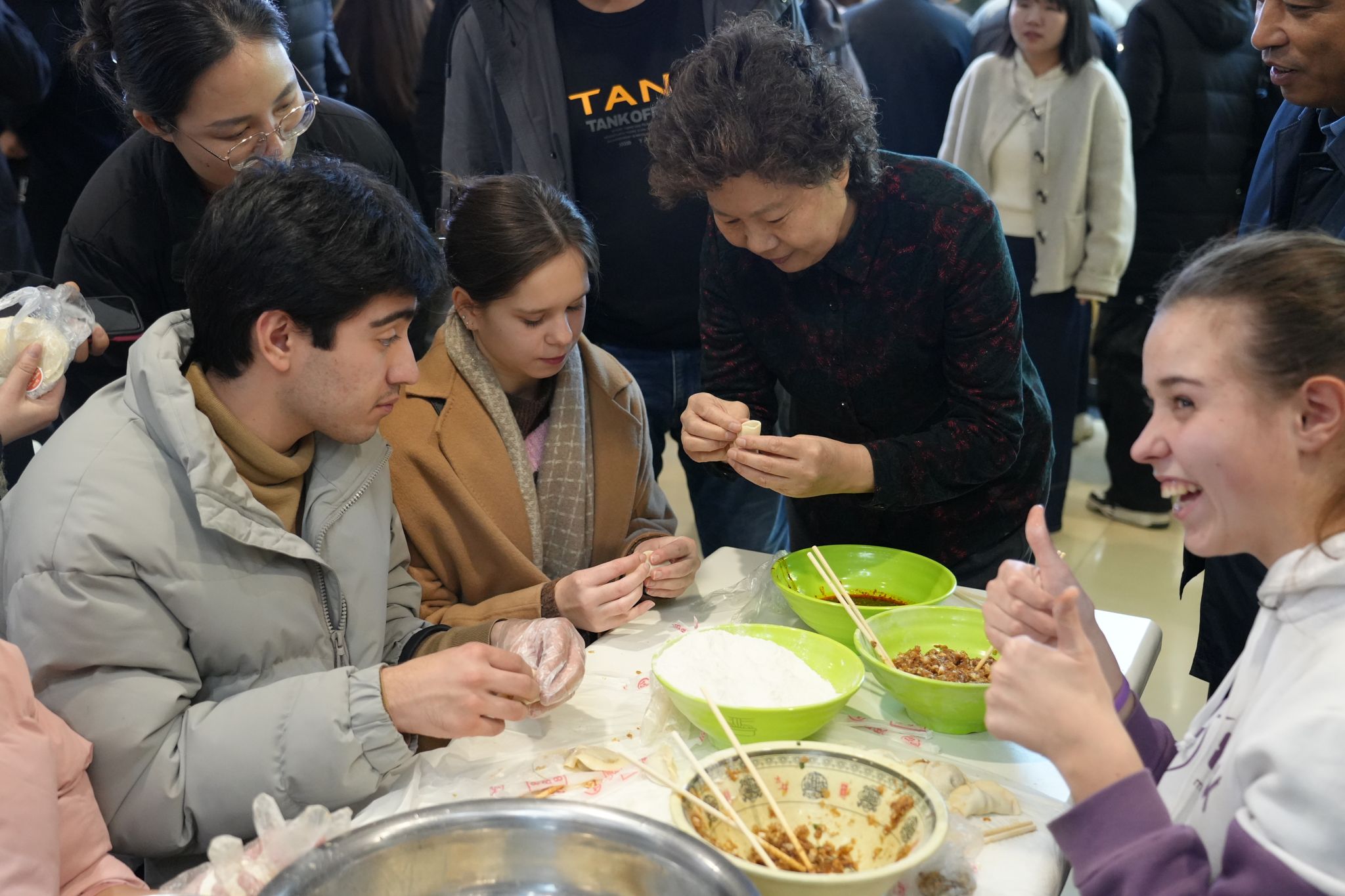 校党委书记周保平带领在校校领导班子成员同学们一起包饺子共同体验传统文化