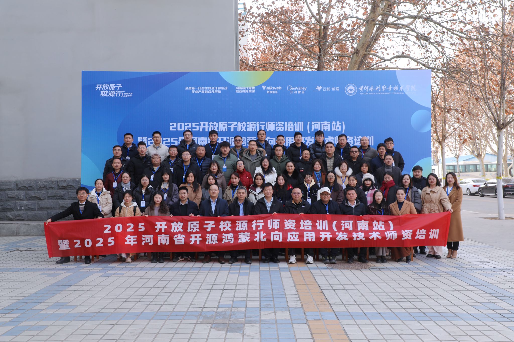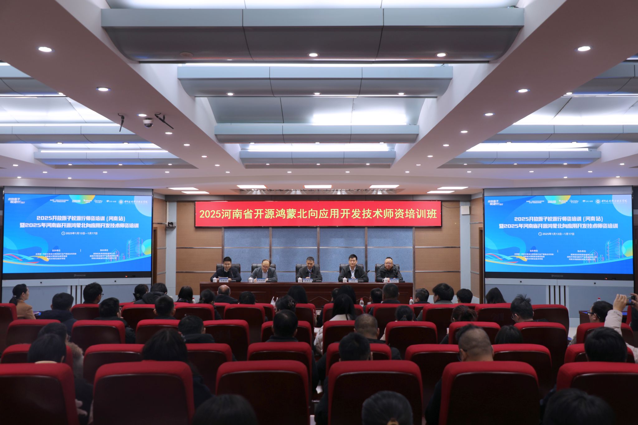 1月13日,2025年开放原子校源行师资培训(河南站)暨2025年河南省开源鸿蒙北向应用开发技术师资培训在我校顺利开班。开班仪式在3号实训馆学术报告厅举行,副校长朱焕立、拓维信息系统股份有限公司营销服务体系副总裁欧阳晓强、河南云和数据信息技术有限公司董事长兼总经理郭凯、拓维信息系统股份有限公司营销中心大区总经理刘凤阳等出席开班仪式,来自省内外20多所院校的70多名教师参加开班典礼,典礼由信息工程学院院长吕振雷主持。