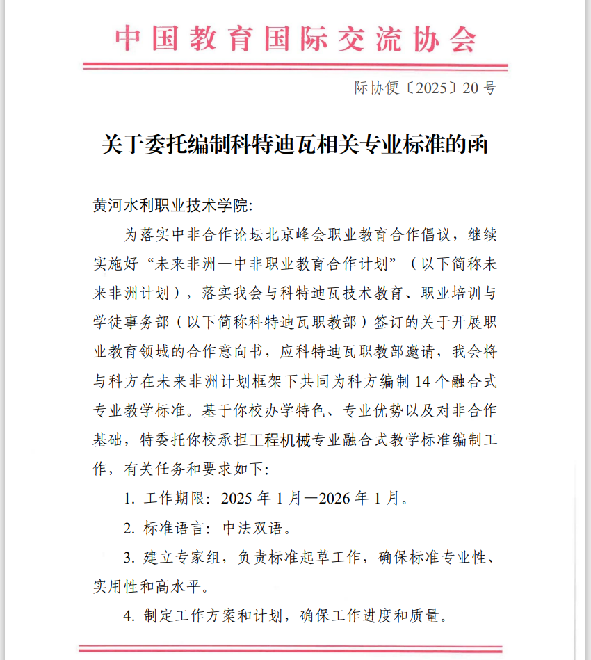 2025年1月,中国教育国际交流协会正式将我校制定的工程机械专业融合式教学标准纳入“未来非洲计划”框架之内,作为为科方编制的14个融合式专业教学标准之一。这一成果不仅标志着我校在中非职业教育国际合作领域迈出了坚实的步伐,同时也彰显了我校在工程机械专业领域的领先地位。