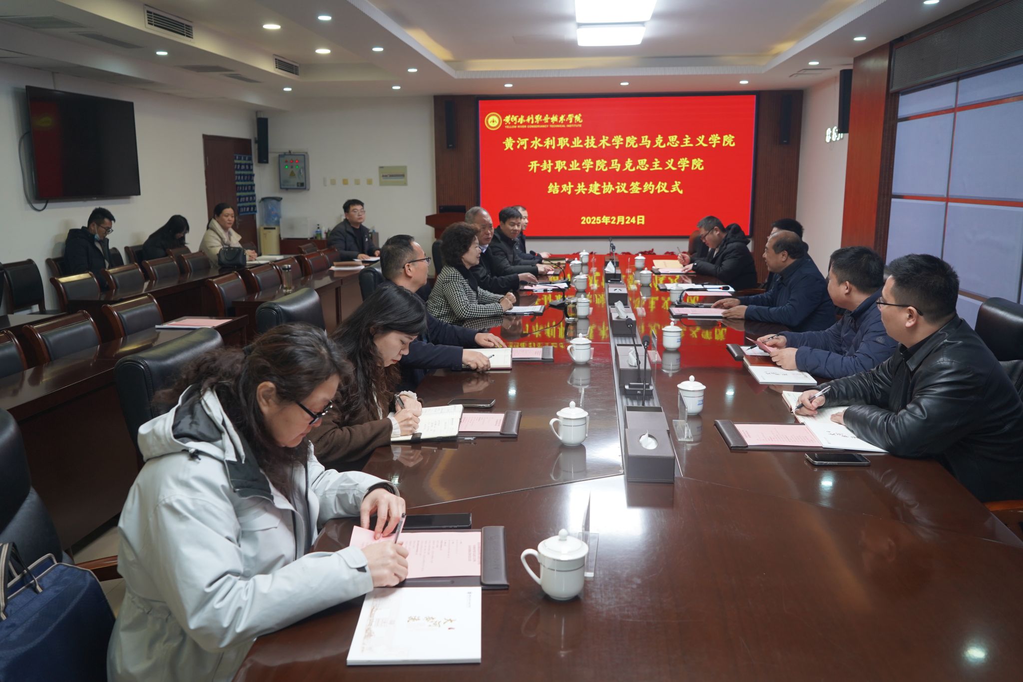 为深入贯彻习近平总书记关于思政课建设的重要指示精神,全面落实河南省教育工委、省教育厅着力推进全省思政课内涵建设的重要部署2月24日,我校与开封职业学院马克思主义学院结对共建签约仪式在行政楼二楼会议室举行开封职业学院党委书记储建新,党委副书记、副校长、马克思主义学院院长马纪岗等一行5人我校党委书记周保平,校党委副书记、工会主席杨士恒,河南省高校青年宣讲名师乔新杰,马克思主义学院领导班子成员出席会议。会议由杨士恒主持。