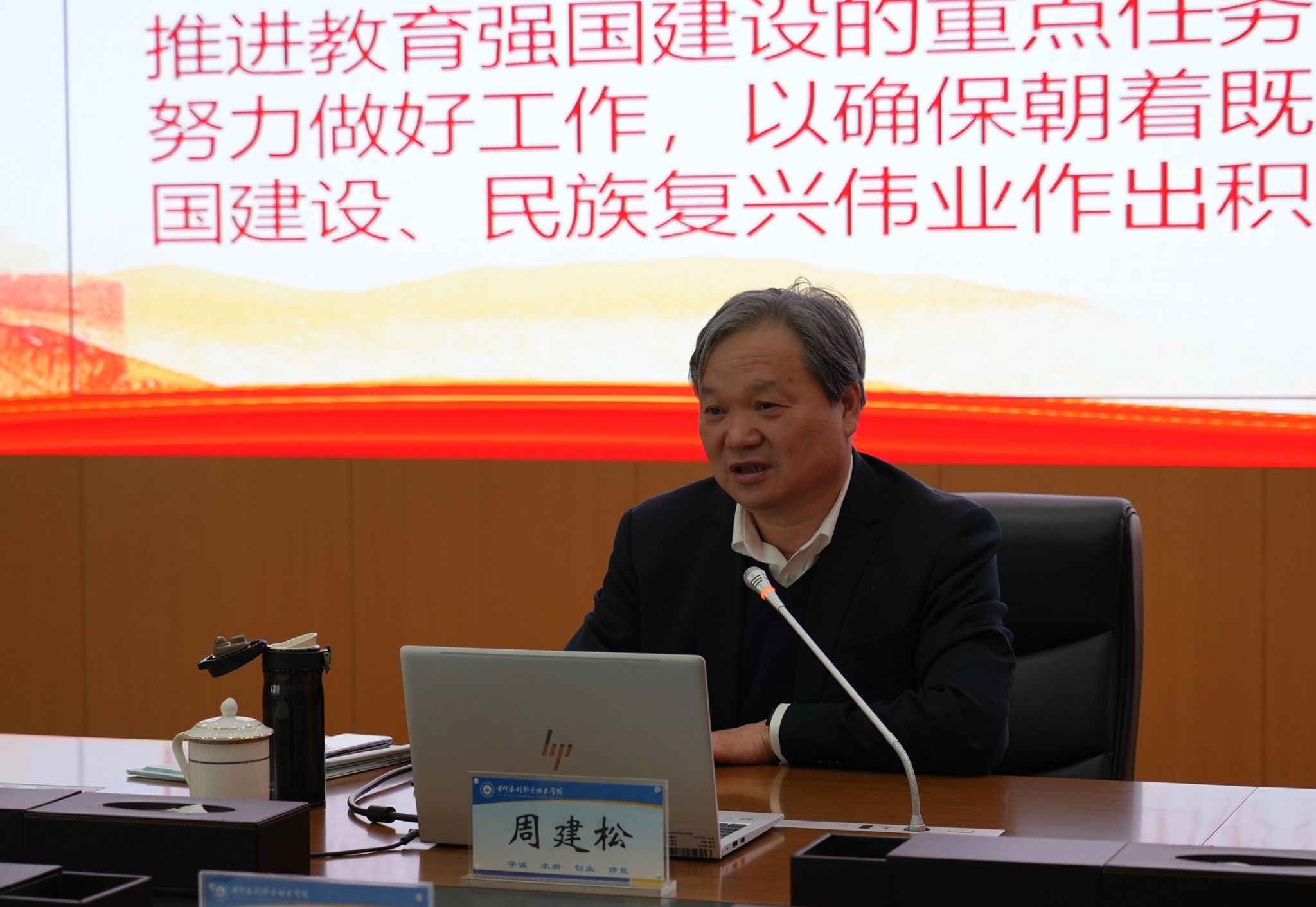 周保平就学习贯彻习近平总书记在全国政协十四届三次会议民盟、民进、教育界联组会重要讲话精神和《纲要》精神提出三点要求:一要提高政治站位,深刻认识习近平总书记重要讲话的深刻意义。习近平总书记的重要讲话,具有很强的政治性、思想性、指导性,为建设教育强国、科技强国、人才强国指明前进方向,凝聚奋进力量。全校上下要深入领会习近平总书记重要讲话的精神实质和精髓要义,深刻领悟“两个确立”的决定性意义,坚决做到“两个维护”,把思想和行动迅速统一到习近平总书记重要讲话精神和党中央决策部署上来。二要立足长远谋改革,加快推进高水平职业本科建设。要用习近平总书记重要讲话精神指导学校工作,推动职业本科建设发展,要对标《纲要》提出的新要求、新使命、新任务,进一步深化教育评价改革,完善人才培养与河南经济社会发展需要适配机制,提升学校治理效能,构建教育科技人才一体化统筹推进机制,为学校跨越式发展提供强大动力支持。三要强化责任担当,不断开创学校工作新局面。全校上下要把学习贯彻习近平总书记重要讲话精神和《纲要》精神,作为当前和今后一个时期的重要任务。深入实施新时代立德树人工程,深化产教融合,切实提升人才培养质量,服务好黄河流域生态保护和高质量发展重大国家战略和河南省“四高四争先”战略,强化海外大禹学院建设,擦亮“大河工坊”河南职教出海名片,为教育强国建设河南实践贡献更大力量。