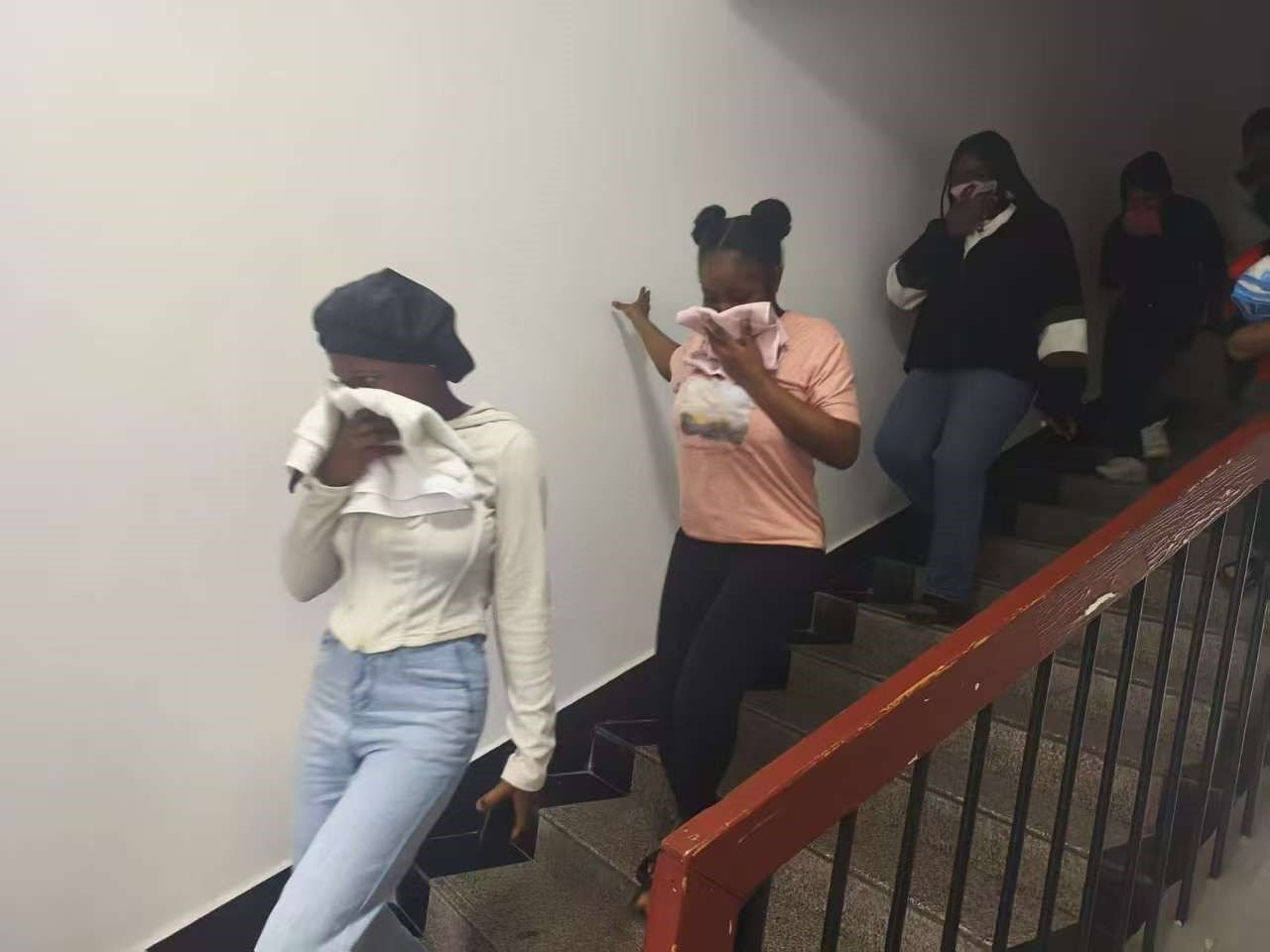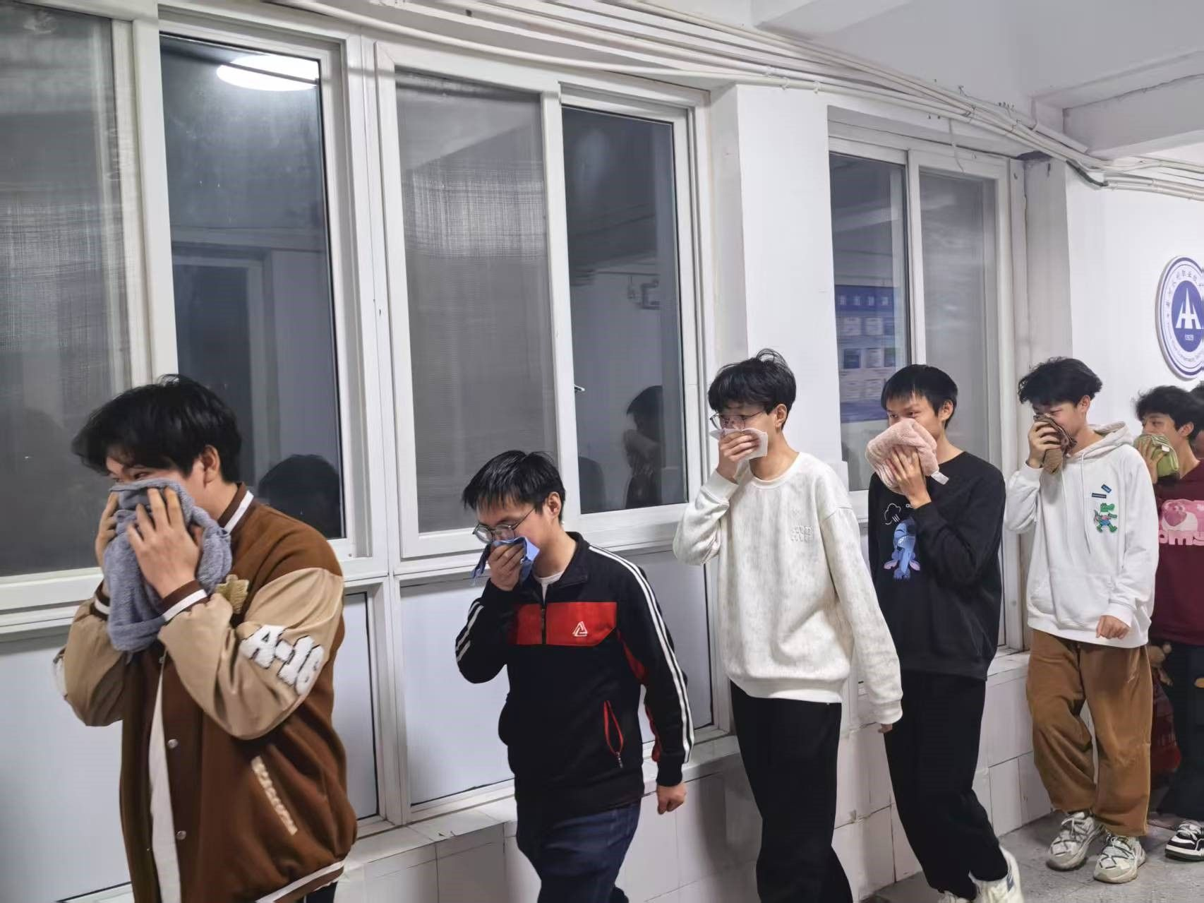 应急疏散演练分为疏散演练和消防知识培训两个环节。在疏散演练中,“疏散警报”警铃声响起,各宿舍长迅速组织学生按照楼层划分的疏散通道有序下楼,楼长和层长第一时间在安全出口引导学生疏散。同学们严格遵循要求,弯腰低姿,用双手或物品护头,快速有序撤离,在规定时间内抵达了集合点,随后保卫部在集合点对学生进行了消防知识培训。