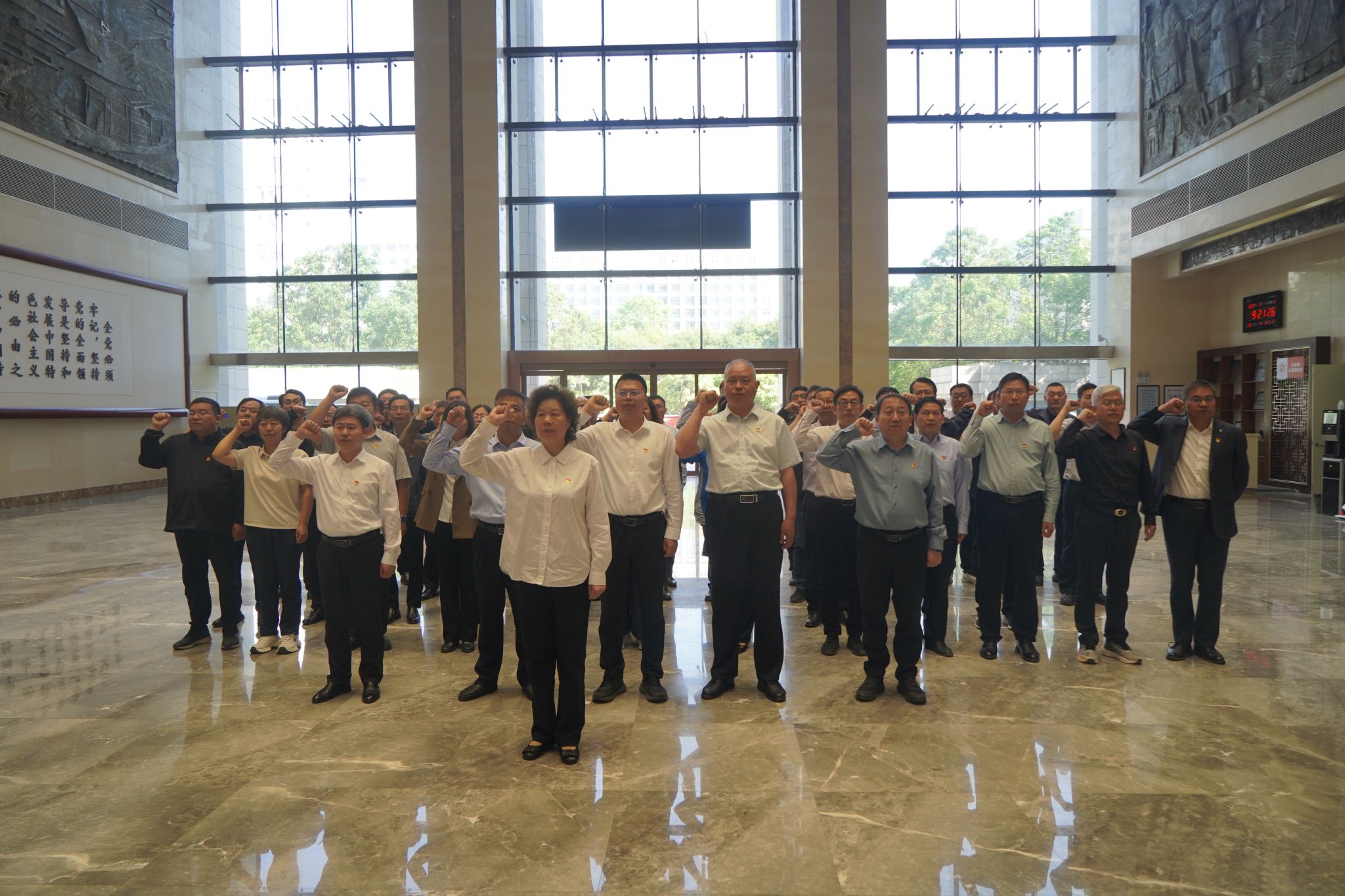 参观学习开始前,学校党委书记周保平带领全体党员干部面向党旗庄严宣誓,重温入党誓词。