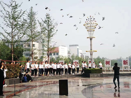 60名团员代表放飞和平鸽白鸽振翅高飞,表达了学子们为实现梦想努力奋斗的决心