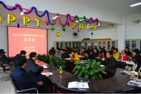 1月10日,机械工程学院在5号实训楼211室召开2017年全国精神文明单位创建动员会,学院全体教职工参会。动员会由院党总支书记孙天星主持。