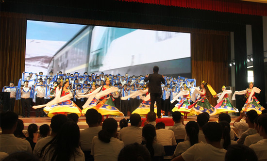 水利工程学院代表队演唱的《天路》,描绘了跨越天险的青藏铁路,把祖国的温暖送到边疆,带领藏族人民走出落后、走向富裕的幸福画面。