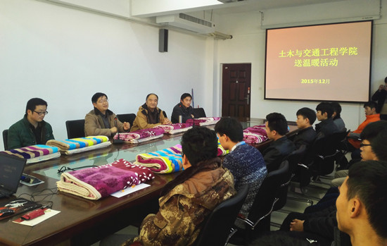 124日,土木与交通工程学院在SX5330室进行冬季送温暖活动。该学院党总支书记赵杰,院长张春满、副院长谭建领,分团委书记朱玮及相关辅导员参加活动。