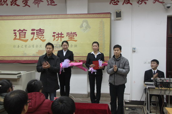 焦红强对两人的先进事迹给予了高度赞扬,希望学生们以他们为榜样,“讲道德、存好心、做好事、当好人”,从身边小事做起,日行一善,做一个勤劳的人,做一个善良的人,做一个有道德的人。他对以“身边人讲身边事、身边人讲自己事、身边事教身边人”的形式讲述道德事迹予以肯定。随后,该系领导为拾金不昧的蒋佳鑫、陈利华颁发了荣誉证书,并向两位同学送去了祝福。