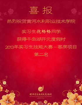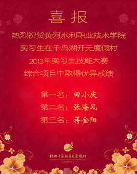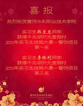1121,我院旅游系校外实习基地——杭州千岛湖开元度假村专门向我院发来喜报,祝贺我院实习学生在该酒店举行的2013年实习生技能大赛中获得佳绩。