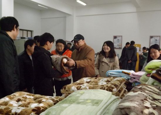 123上午,一幅温馨的画面出现在机电工程系辅导员办公室4202:系领导将毛毯亲手送给学生们。一句句感谢老师的话,一个个幸福甜蜜的微笑,关爱温暖了这个寒冬。