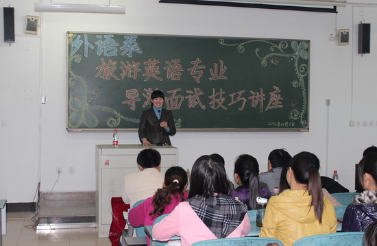 今年9月份,旅游英语专业2010201155名同学顺利通过导游资格考试笔试环节。为了让他们在随后的面试中能流畅地进行导游讲解、自如地应对面试中出现的各种问题,从而取得优异的成绩;同时也为2012级新生增进对本专业以及导游考试的了解提供学习交流的平台。外语系于118日下午举办了导游考试面试技巧专题讲座,由开封市旅游局培训中心主任杨蕴杰主讲。外语系党总支书记关六三、副主任王成伟、外语系旅游英语专业教师以及旅游专业全体学生聆听了此次讲座。