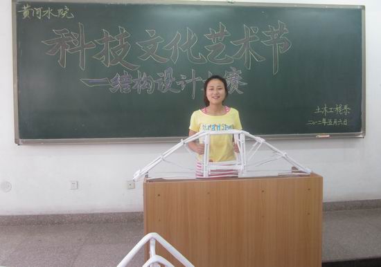 思想的力量足以让小小的模型承载上百斤的重量,各小组将自己制作的作品展示给评委、同学,并为众人做了详细的介绍。参赛者用纸和胶水制作出了各种各样的模型,在不同角度、运用各种不同的力学知识扩大其承载能力。为了本次比赛,土木系选派专业老师为学生辅导,最终确定模型结构。经过比较和实体加载检验,最终选出8组作品获奖。这8组模型也将代表学院参加河南大学、开封大学、黄河水利职业技术学院三校联办的结构大赛参加比赛。