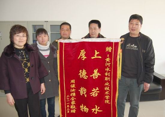 3月25日,管理系文秘0902班学生周俊汝在其家人的陪同下,将写有“上善若水,厚德载物”八个大字的一面锦旗和一封感谢信,送到管理系党总支副书记和副主任周爱荣的手中,表达她和她家人对黄河水院的感激之情。