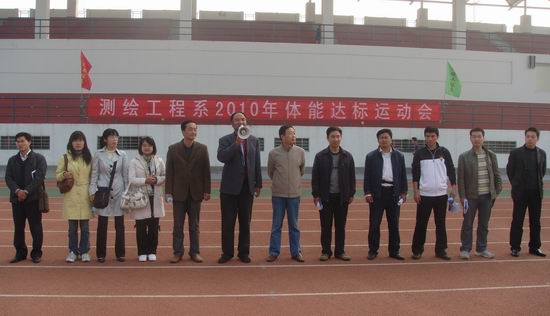10月24日,测绘工程系在祥云体育场举行了2010年体能达标运动会。测绘系党总支书记周建郑、系主任赵杰、副书记刘广社、副主任纪勇出席了运动会开幕式,系办主任何宽、工学办主任师军良、学工办主任高琼、全体辅导员及全系学生参加了运动会。开幕式由刘广社副书记主持。