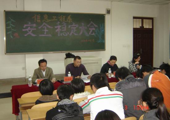 为了加强对学生的安全管理,创造一个有序、安全、文明的学习生活环境,11月3日,信息工程系在教学楼3201室召开安全稳定工作会,系党总支副书记殷莺、学工办负责人彭战松及相关辅导员与会。