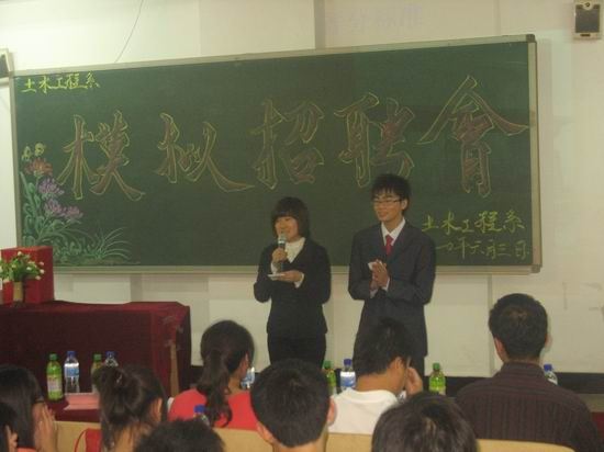 6月3日下午,土木工程系第二届模拟招聘会决赛在教学楼2202室举行。本次招聘会主题为“关爱大学,携手就业”。土木系书记叶建海、分团委书记管欣、工学办主任万勋及部分教师担任比赛评委。