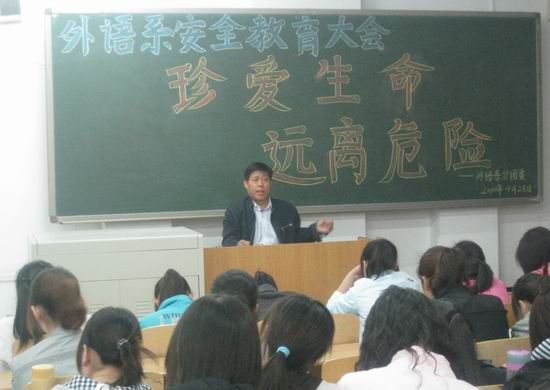 为加强对学生的安全意识教育,4月28日下午,外语系在教学楼2202室召开安全教育大会。系直属党支部书记樊建科、分团委书记王成伟、部分辅导员及学生200余人参加了会议,会议由樊建科书记主持。