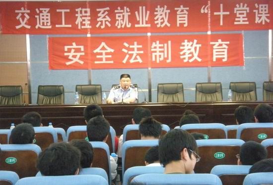 为了更好的贯彻落实学院安全教育月活动,511日下午,交通工程系邀请金明公安分局为该系0809级全体学生举办了一场法制教育讲座,金明公安分局政委吕杰、副政委刘亚洲、指挥室主任段政,交通工程系党总支书记孙天星、副书记杜广平等领导参加了法制报告会,报告会由该局西郊乡派出所所长周冲主讲。