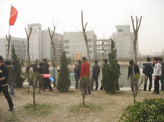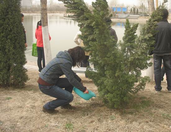 参加活动的学生首先在长廊集合完毕,随后在行政楼前开始绿化活动。同学们对环境进行了清理打扫,将长期没人清理的草坪进行了清理,用手把草坪上的瓜子皮、塑料袋、废纸屑捡起来丢到垃圾箱内。随后,用自己自带的水桶与盆具从湖里打水,积极的为花草树木浇水滋润。一番火热的劳动之后,一棵棵清新的小树呈现出来,散发出春的蓬勃气息。