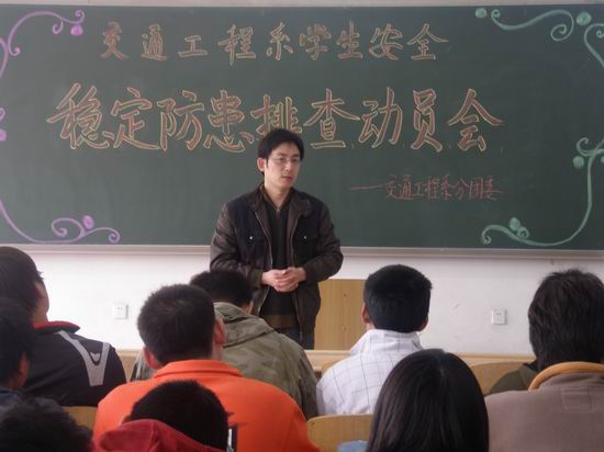 为贯彻落实学院安全稳定工作会议精神,3月24日上午,交通工程系在教学楼3510教室召开了学生安全稳定隐患排查工作,系党总支书记孙天星、副书记杜广平、全体辅导员及学生骨干共100余人参加了会议,系学工办主任焦东良主持会议。
