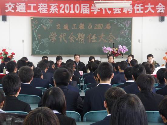 12月22日上午,交通工程系2010届学代会聘任大会在教学楼4401室召开。院团委副书记谷献晖、交通系党总支书记孙天星、系主任务新超、副书记杜广平、学工办主任焦东良、09级辅导员朱一飞及部分兄弟系部分团委书记出席此次会议。