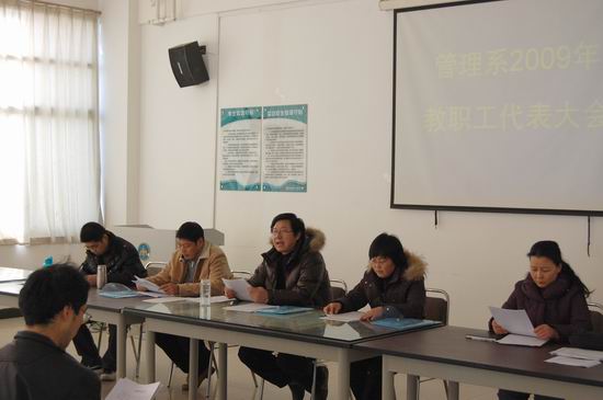 1229下午,管理系2009年度教职工代表大会在8号综合实训楼8408室召开。管理系主任孙全治,系副书记、分工会主席罗朝峰,副主任周爱荣及全体教职工参加了会议。会议由周爱荣副主任主持。