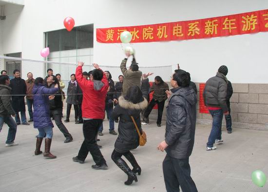 会后,机电系在实训楼院内进行了新年游艺活动,系全体老师参加了活动。这次安排有欢乐踩气球、托乒乓球接力赛、心灵手巧(夹玻璃球)、力争上游(双升)比赛等五个集体活动项目。活动从全体教师参加的欢乐踩气球开始,托乒乓球接力赛体现了教师们的团队意识,喜庆满天气球赛把活动推向了高潮,渲染了欢快的游艺气氛。活动中大家和谐竞争,各展风采,营造了浓厚的节日氛围。