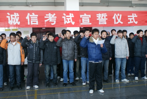 宣誓仪式在班级辅导员的组织带领下进行。仪式开始前,辅导员详细讲解了诚实守信的重要性和本次活动的必要性,然后宣誓仪式正式开始,每个班在班长的带领系下,庄严的举起右拳,面向其它班级同学庄严宣誓:“……端正考试态度,明确考试目的,严守考场纪律,坚决做到诚信考试,用诚信铸造品格,用诚信收获成功,用诚信鼓起前进之帆……”