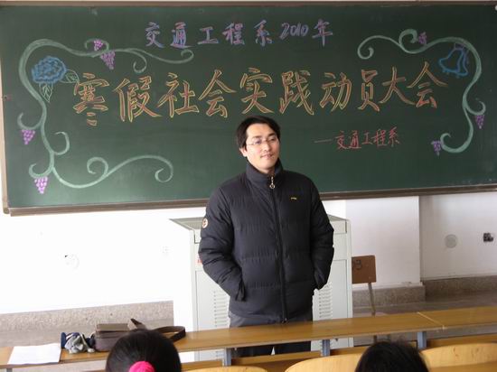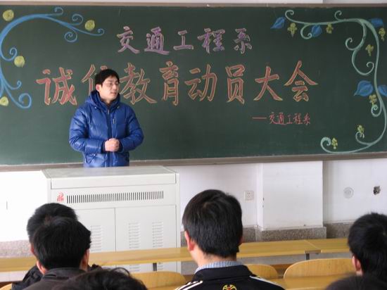 114下午,交通工程系在教学楼6503室和6403室召开了诚信教育动员大会和2010年寒假社会实践动员大会,系党总支副书记杜广平、分团委书记焦东良、各年级辅导员和0809级全体学生参加了大会。