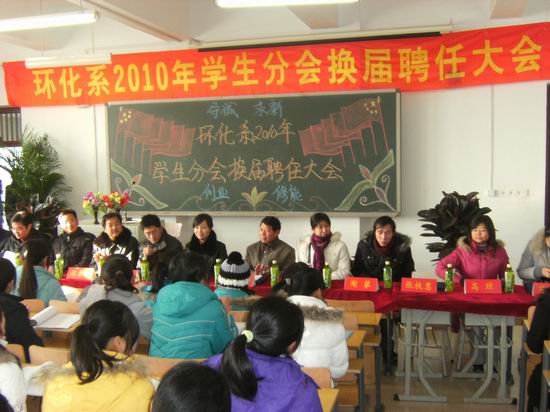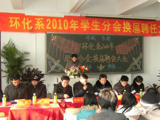 12月20日上午,环化系在教学楼2503教室举办了2010年学生分会干部换届聘任大会。院团委副书记谷献晖、学生处副处长李响、环化系主任李党生、书记陈志强、副书记楚万强及其他系的部分分团委书记参加会议。