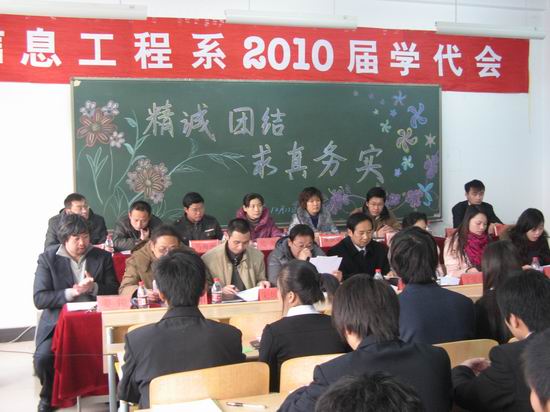 12月12日上午,信息工程系2010届学生代表大会在教学楼3410室召开,院团委书记周志琦、学生处副处长朱焕立、信息系党总支书记何聚坤、系主任丁爱萍、副主任万朝阳、副书记姜锐、各教研室主任及各级辅导员出席了此次大会。
