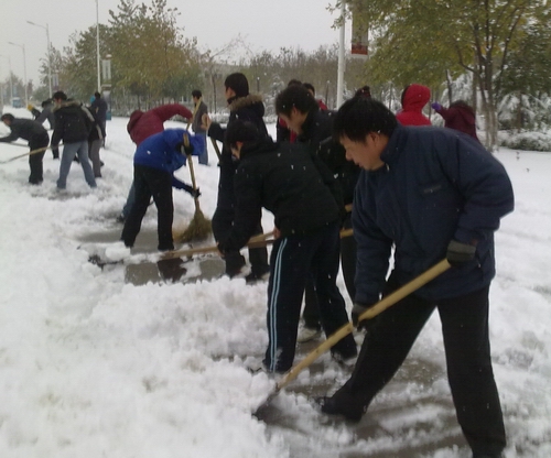 11月12日,一天一夜的大雪把整个校园装扮的银妆素裹,但是道路的积雪却给师生们带来了不便。