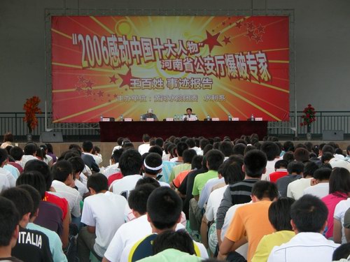519下午3点,由院团委、水利系共同组织的“2006年感动中国十大人物之一”王百姓事迹报告会在风雨球场举行。副院长刘紫婷、院团委书记周志琦、副书记谷献晖、水利系党总支部书记来卫东、主任刘纯义、副书记薛建荣、副主任罗全胜参加了报告会。